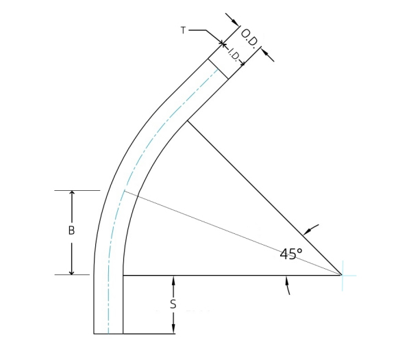 45 ° LR (długi promień) Zęby rurowe mają wymiar środka do twarzy o średnicy 1,5 x. Są najczęstszym rodzajem łokcia i są używane, gdy dostępna jest przestrzeń, a przepływ jest bardziej krytyczny. Podczas procesu produkcyjnego rur na zimno można użyć maszyny do zginania rur CNC do wchylenia prostych rur w zakrzywione rury jednocześnie.